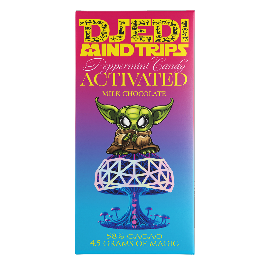 Smooth artisan Pink Peppermint Milk Chocolate Magic Mushroom Bar, perfectly blended from 58% ceremonial-grade cacao and a splash of cool peppermint, infused with sacred fungi for steady mood support, clean energy, and calm mental clarity. 15 squares, 60 grams chocolate, 4.5 grams sacred fungi
